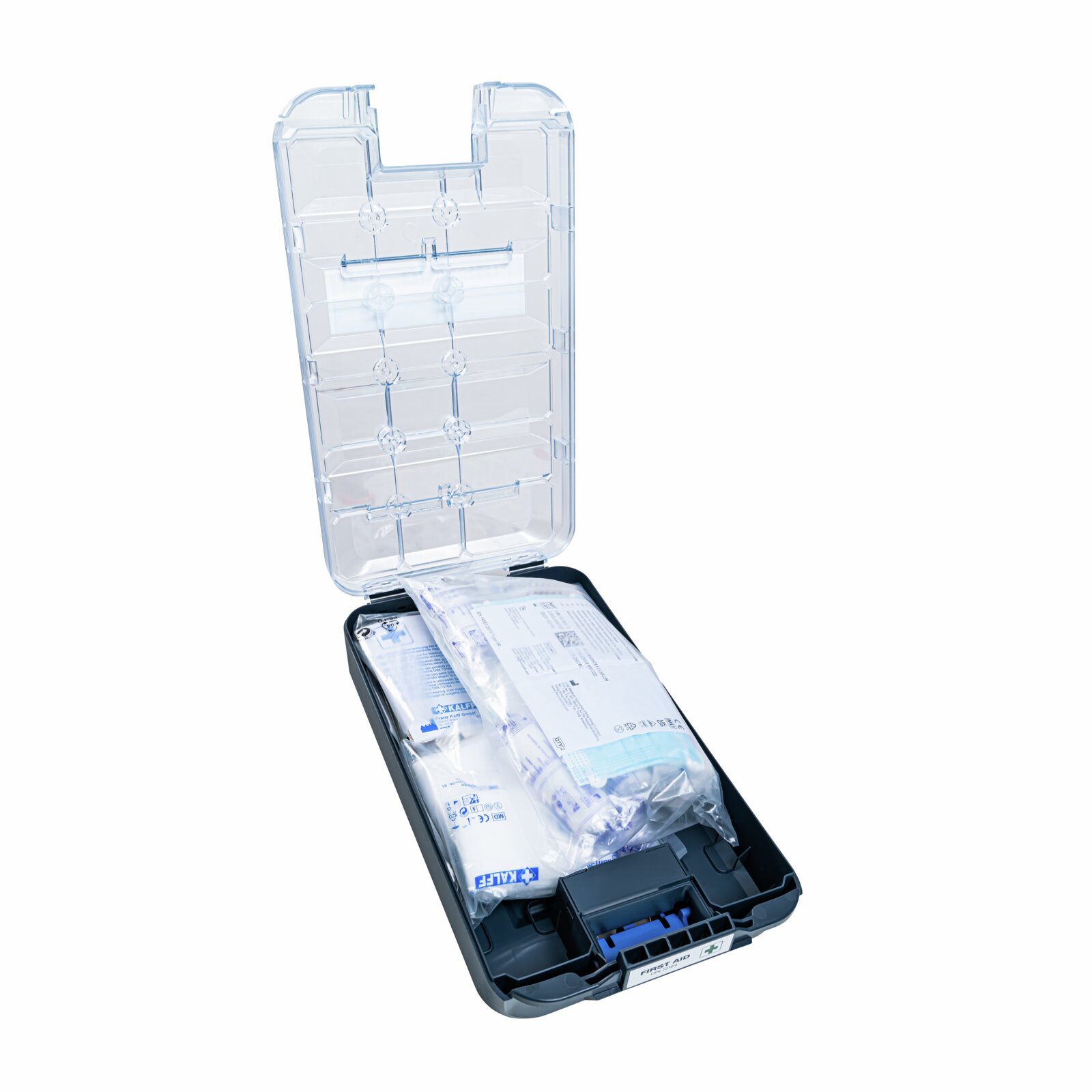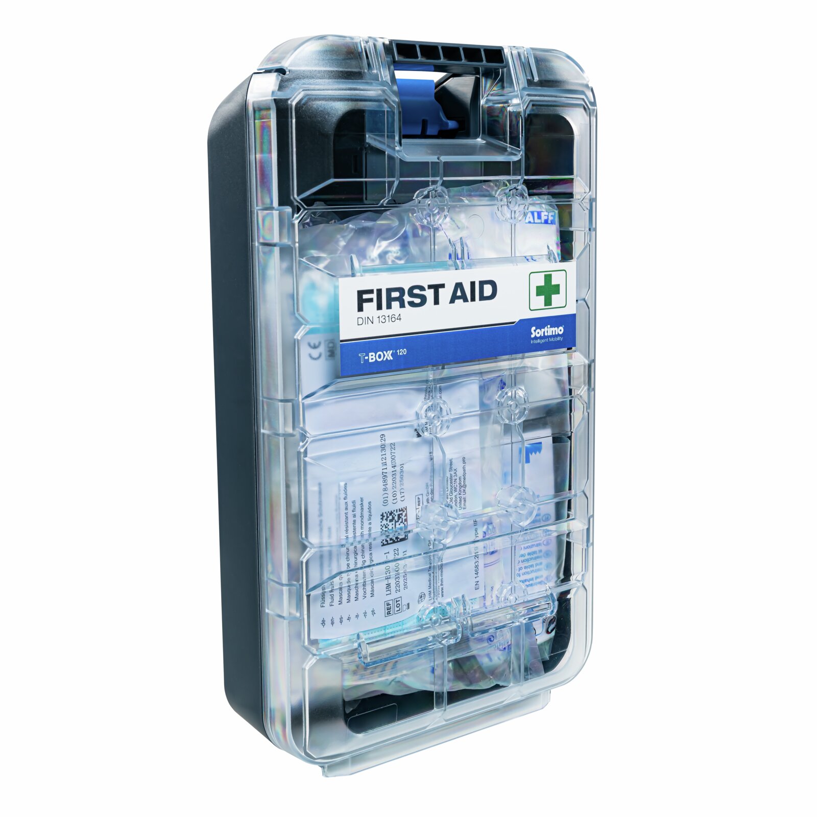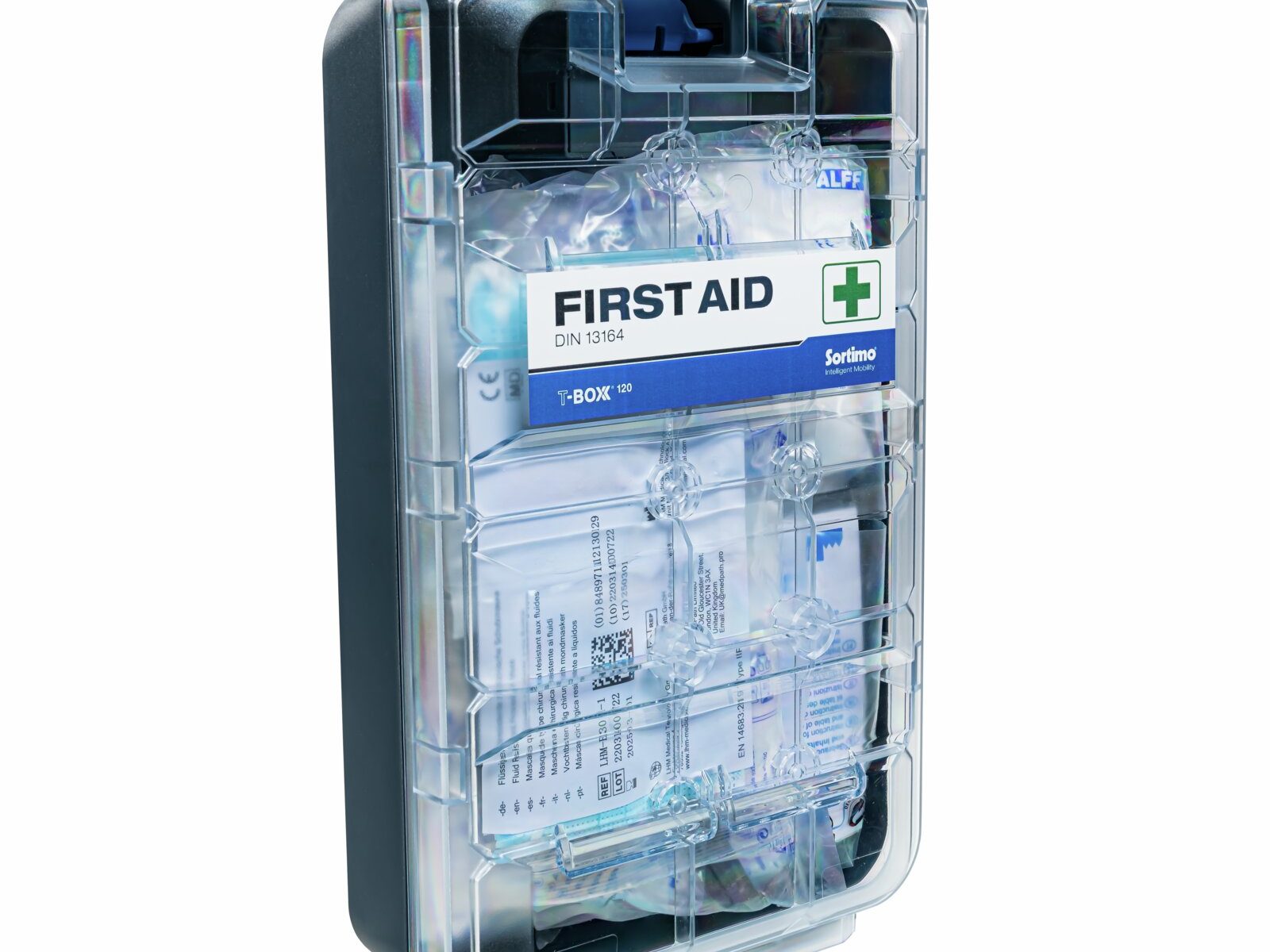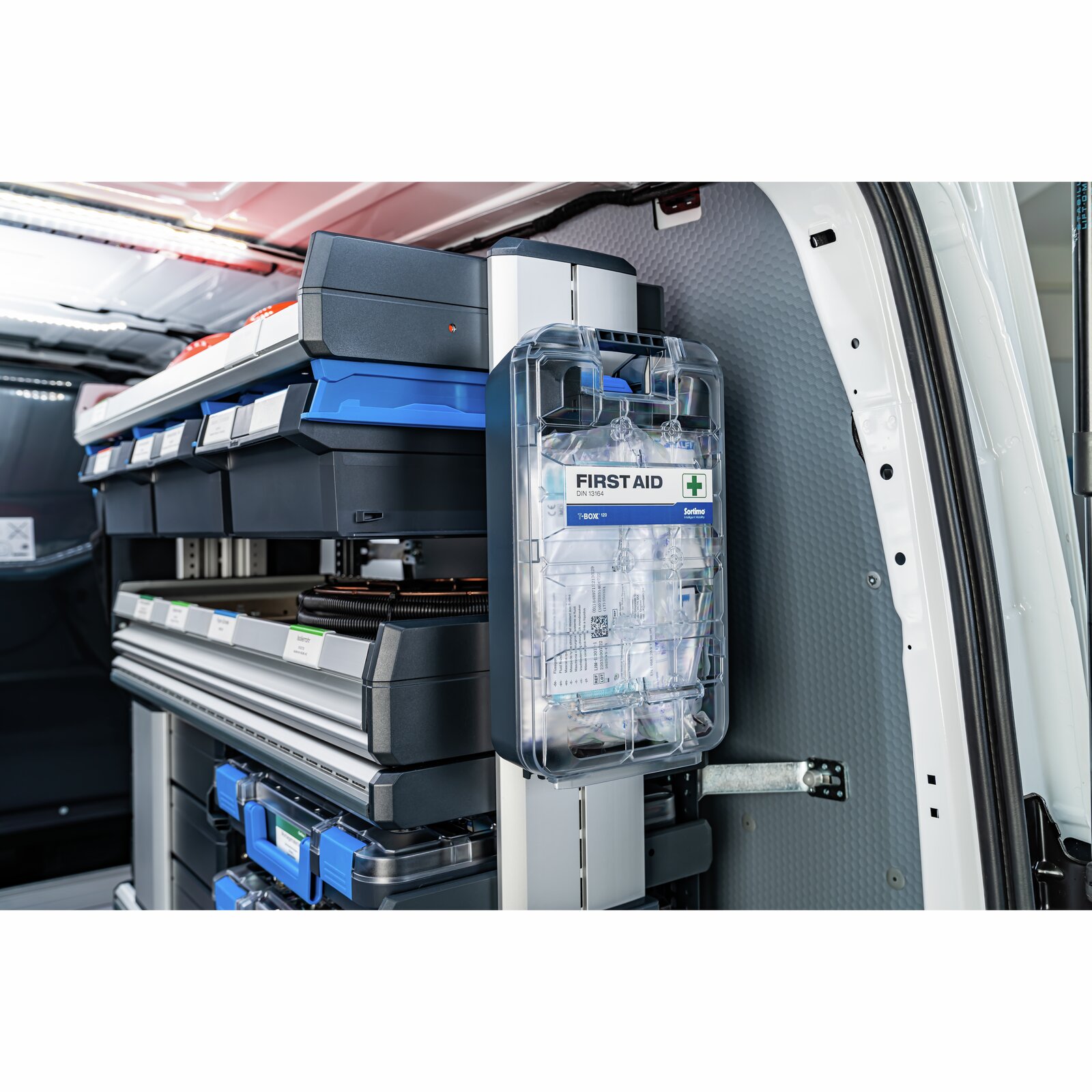 Apteczka pierwszej pomocy T-BOXX 120 do samochodu osobowego jest wyposażona zgodnie z normą DIN 13164. Może być stosowana zarówno w samochodach osobowych, jak i dostawczych. Dzięki zintegrowanemu haczykowi ProClick, apteczkę T-BOXX 120 można umieścić w różnych miejscach na regałach w furgonetce lub w pojeździe, aby była zawsze pod ręką w nagłych wypadkach. Przezroczysta pokrywa zapewnia stały podgląd zawartości apteczki. Częściowo zużyte lub brakujące materiały opatrunkowe można zatem łatwo zidentyfikować i uzupełnić.